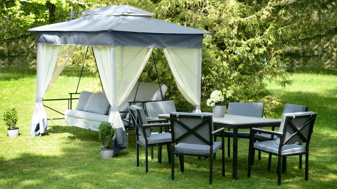 - мебели садовой, террасной для лаундж-зон и патио (качели садовые, перголы, шатры, наборы мебели, кресла, диваны, лежаки, качалки и др.);